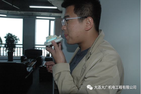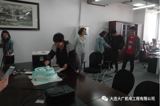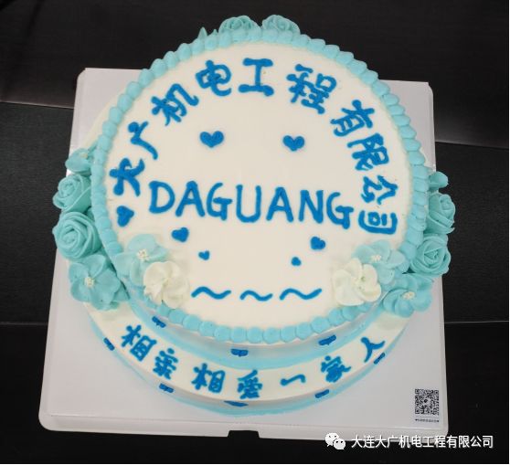 蛋糕以大連大廣機(jī)電工程有限公司logo的藍(lán)白色調(diào)為主色,大廣之家,永遠(yuǎn)是相親相愛(ài)的一家人。